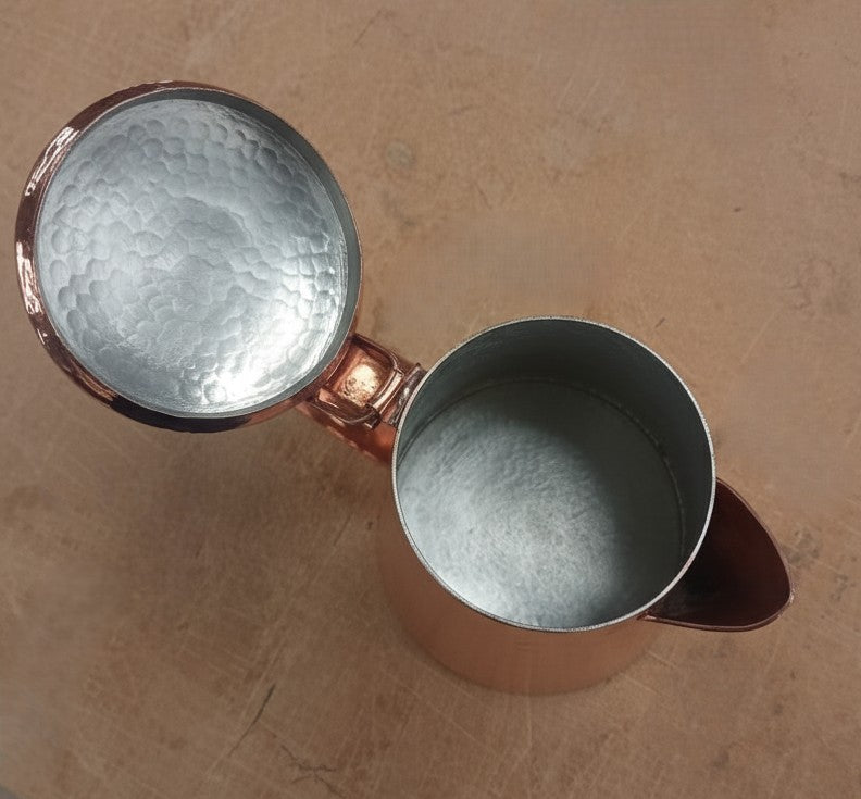 Elegant copper teapot with lid, it is handmade with hand-hammered solid recycled copper, tin-lined on the inside a wonderful decorative model that can be used as a teapot, or oil pot. Our product is made of copper with 100% handmade labor. Our expert coppersmiths create a piece of art with a hammered finish that will give an elegant, sophisticated, and natural touch to your kitchen, exhibition, or a restaurant bar.