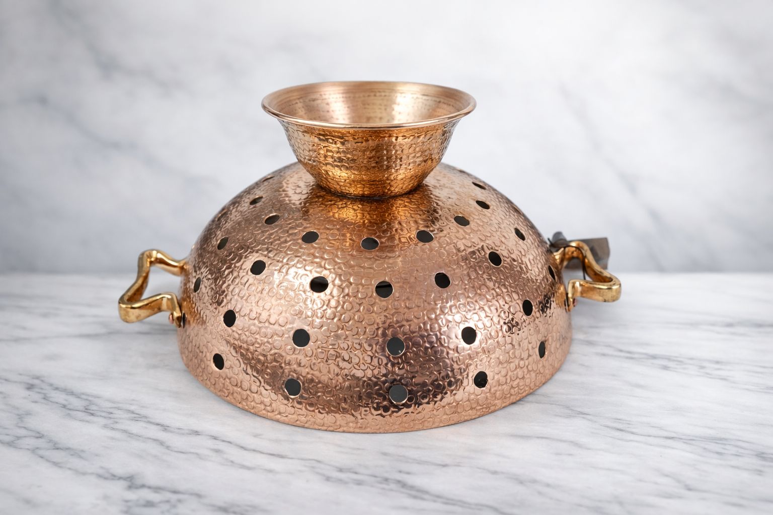 Introducing the hand-hammered copper colander, a standout addition to your cherished copper kitchen. Crafted from solid recycled copper, this colander features a tin-lined interior that ensures durability and prevents reactions with acidic foods. The exterior showcases a unique hand-hammered dot pattern, adding both texture and elegance.